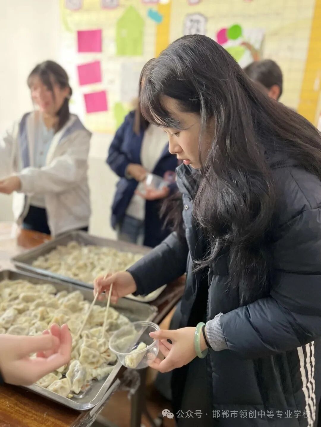同学们跟着老师学得有模有样,有的手法娴熟快速包出饱满的月牙饺,有的创意十足捏出卡通造型的 “趣味饺”,欢声笑语中,一个个形态各异的饺子在掌心成型,不仅包裹着鲜香的馅料,更裹着师生间的亲密情谊。