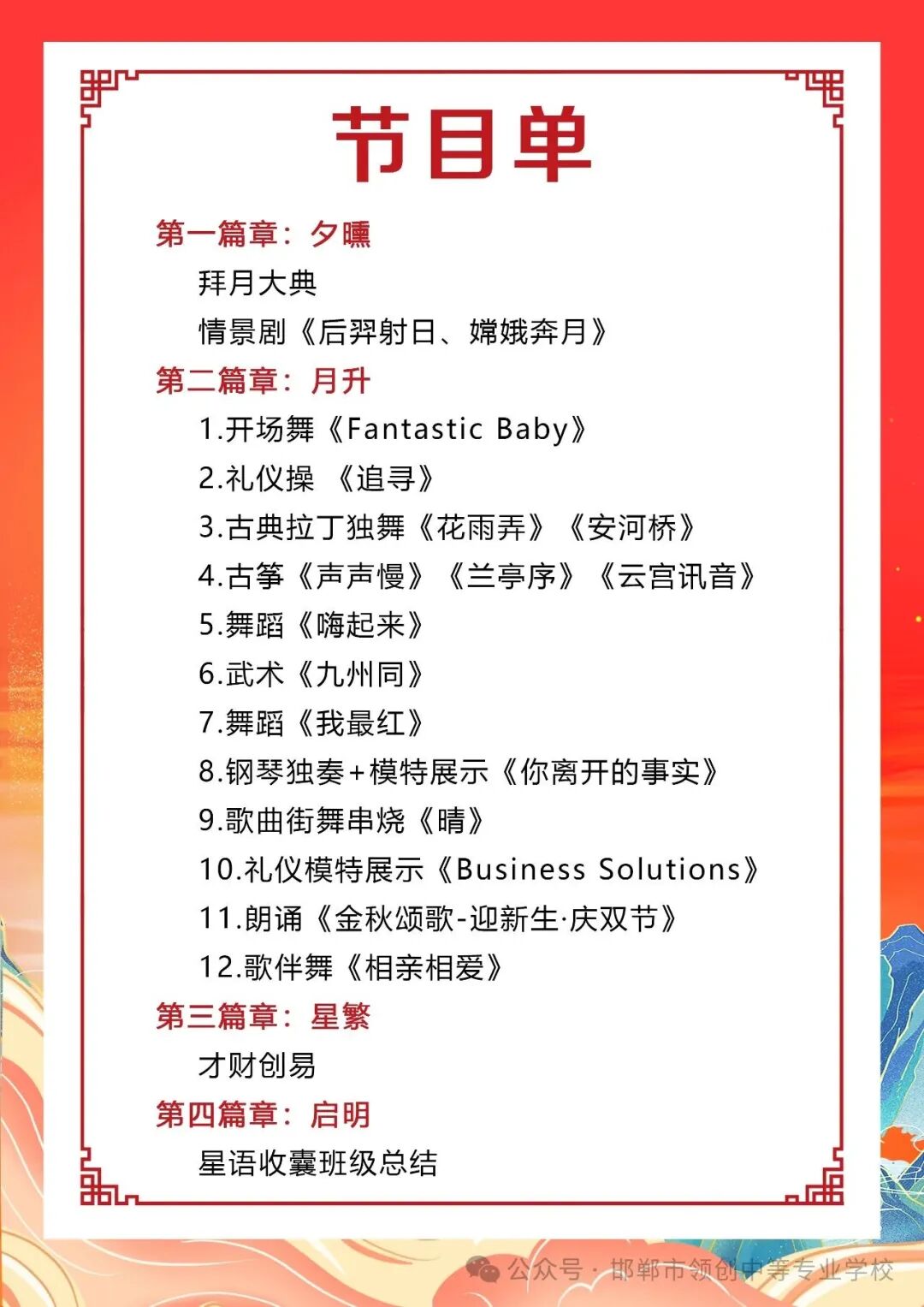 为将我校 “玩中学,学中玩” 的核心教育理念转化为沉浸式体验,让学子在传统文化浸润与多元实践中收获成长,9月28日晚,邯郸市领创中等专业学校精心策划的“月满中秋迎国庆,情暖校园迎新生”迎双节暨迎新生活动。