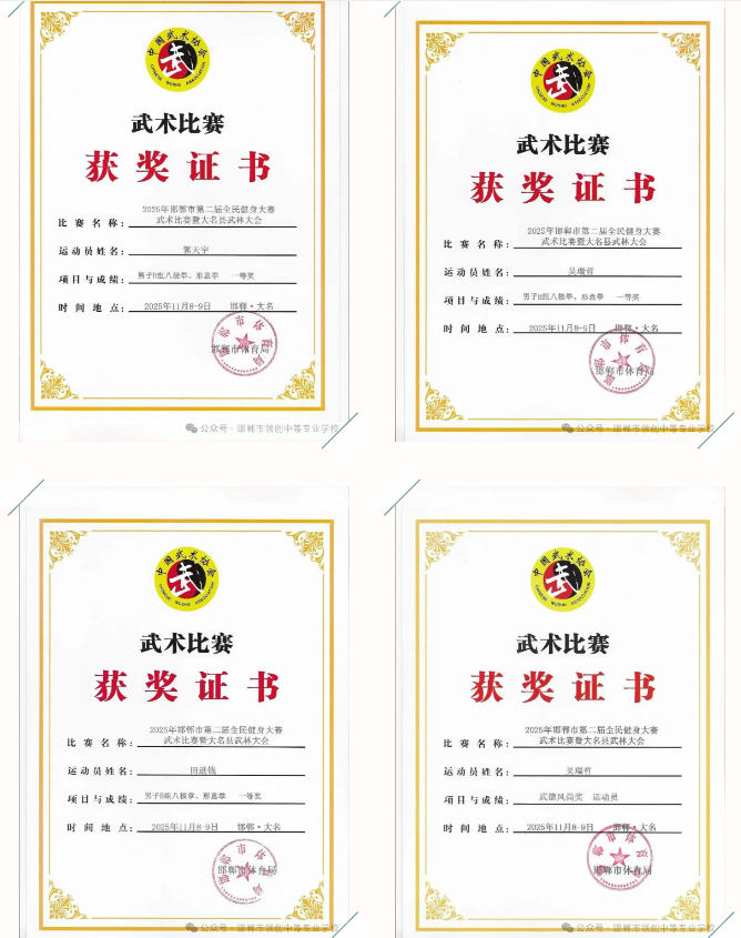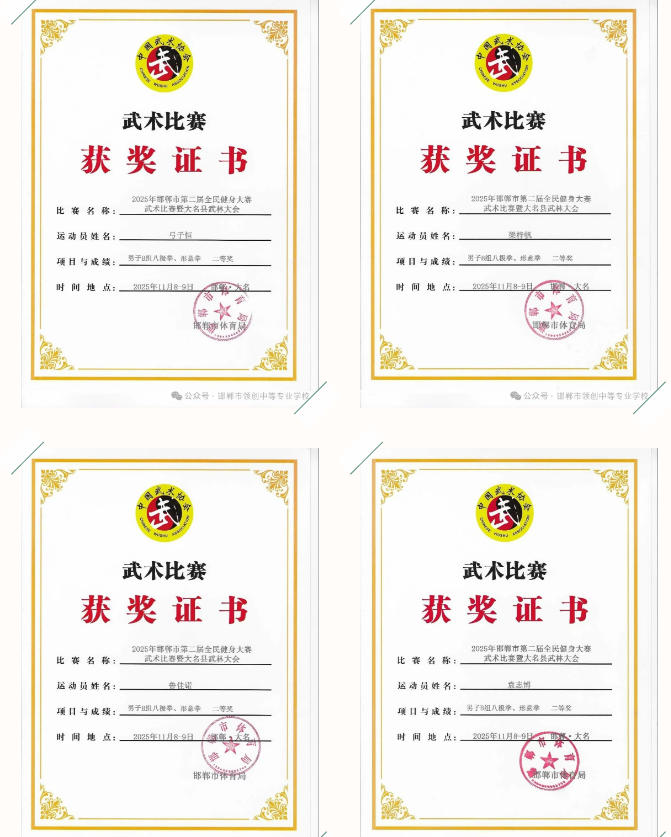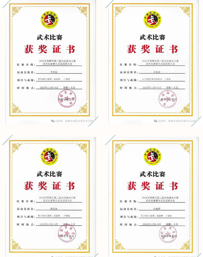 领创中专学子在赛场上精神抖擞、招式娴熟,充分展现了中华传统武术的独特魅力与青春风采:田进钱同学勇夺拳术组第一名、器械组第二名,郭天宇、吴瑞哲同学双双斩获拳术组第一名,袁志博同学拿下器械组第一名与拳术组第二名;武嘉豪、鲁佳诺等 8 名同学分获拳术组、器械组第二名,武嘉豪、王德月等 9 名同学荣获拳术组第三名;贾燕姿、吴瑞哲同学获评 “武德风尚” 优秀运动员,申旭刚老师被授予 “武德风尚优秀教练员” 称号。