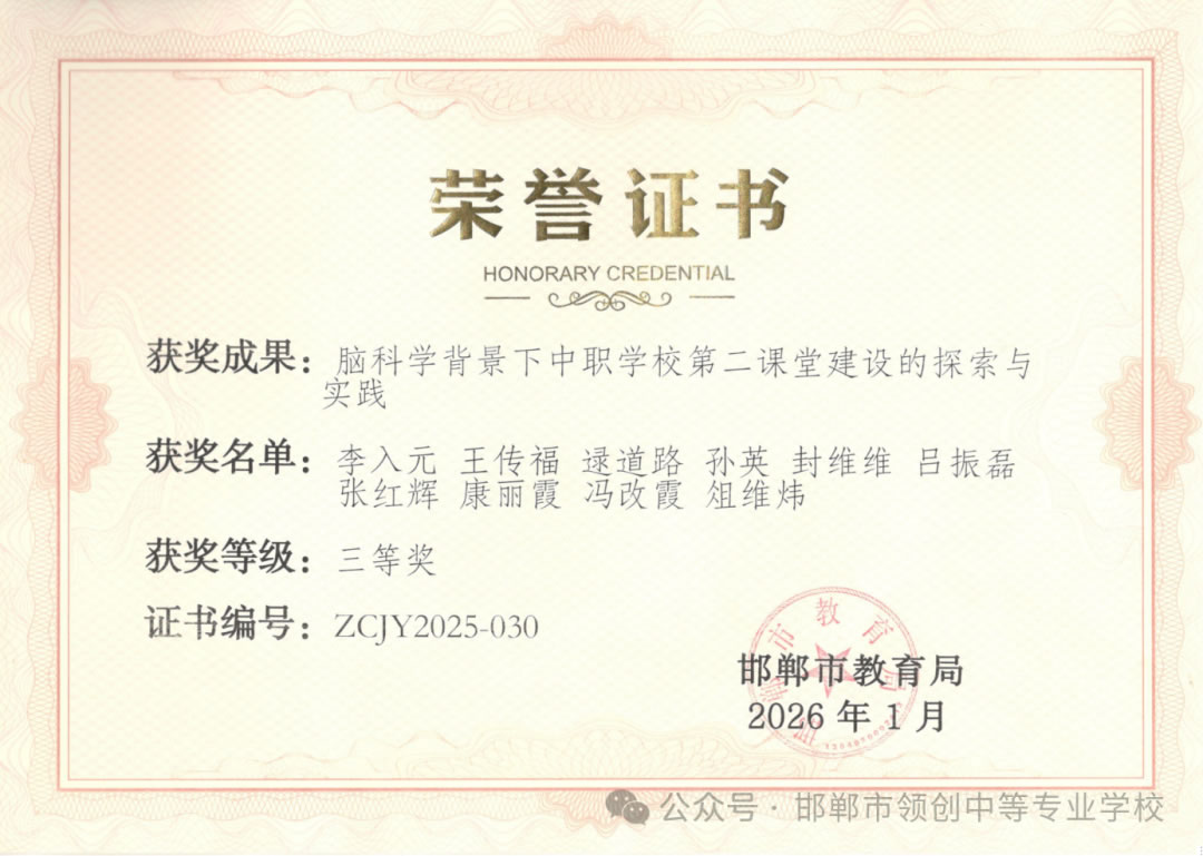 捷报传来,喜讯盈园!近日,2025年邯郸市职业教育教学成果奖评选结果正式揭晓,邯郸领创中等专业学校申报的《脑科学背景下中职学校第二课堂建设的探索与实践》成果,历经申报、学校初审、市级专家严苛评审等层层考验,成功荣获三等奖,这是市级教育主管部门对我校民办中职育人特色、创新实践成效的高度肯定与有力鞭策!