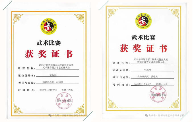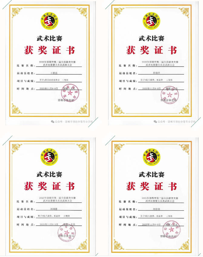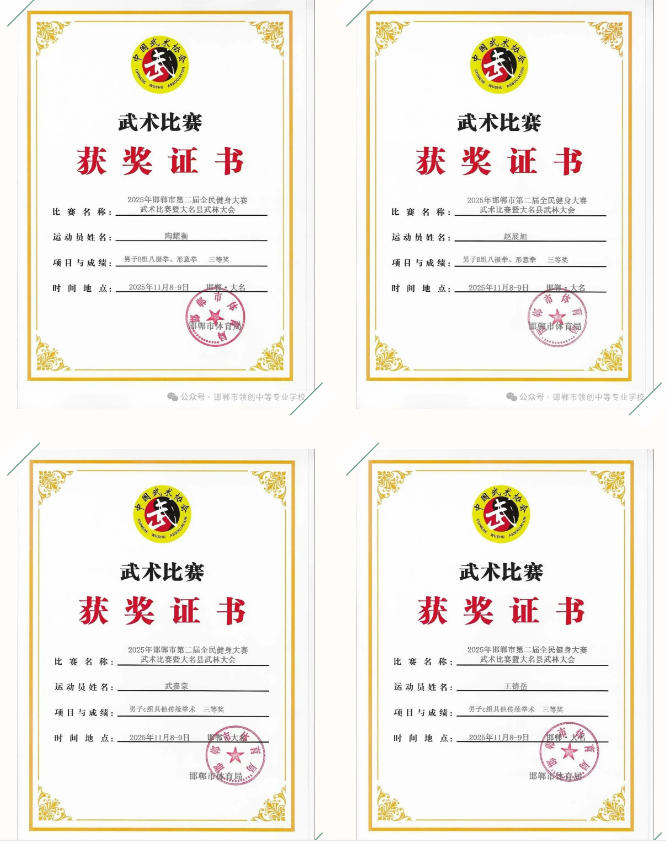 领创中专学子在赛场上精神抖擞、招式娴熟,充分展现了中华传统武术的独特魅力与青春风采:田进钱同学勇夺拳术组第一名、器械组第二名,郭天宇、吴瑞哲同学双双斩获拳术组第一名,袁志博同学拿下器械组第一名与拳术组第二名;武嘉豪、鲁佳诺等 8 名同学分获拳术组、器械组第二名,武嘉豪、王德月等 9 名同学荣获拳术组第三名;贾燕姿、吴瑞哲同学获评 “武德风尚” 优秀运动员,申旭刚老师被授予 “武德风尚优秀教练员” 称号。