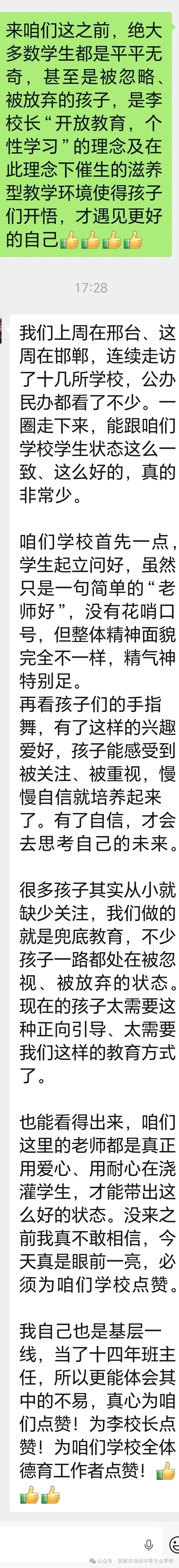 而近日,省教育厅领导在连续走访邢台、邯郸两地十余所公办、民办院校后,主动为邯郸市领创中等专业学校写下百字点赞评语,这份跨越行政身份的真诚认可,在快节奏、重效率的当下显得尤为珍贵。
